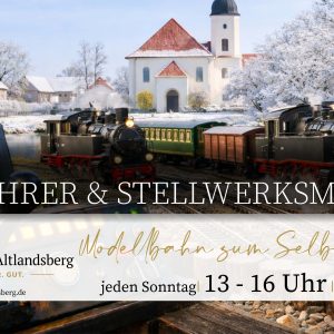Ab dem 18. Januar steht das Schlossgut Altlandsberg jeden Sonntag von 13:00 bis 16:00 Uhr ganz im Zeichen der Modellbahn. In der Orangerie, im Raum neben der Galerie, befindet sich eine liebevoll gestaltete Anlage, die kleine und große Eisenbahnfans gleichermaßen begeistert. Das Besondere: Hier darf nicht nur geschaut, sondern auch selbst ausprobiert werden. Kinder, Jugendliche und Erwachsene können...