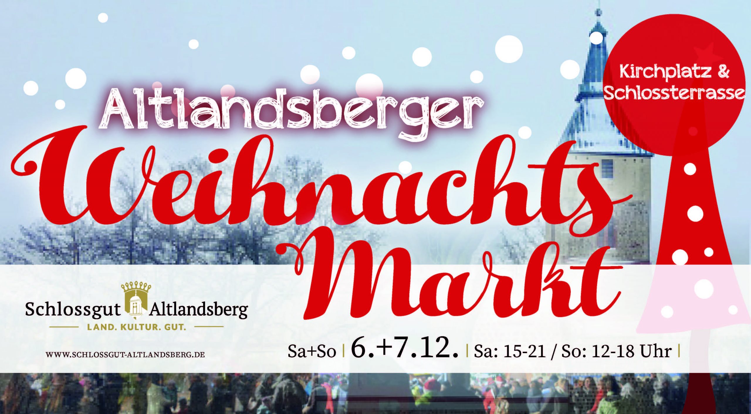 Veranstalter ist der Freundeskreis der Evangelischen Kirche Altlandsberg. Traditionell findet am 6.12. von 15.00 – 21.00 Uhr und am Sonntag den 07.12. von 12.00 – 18.00 Uhr der Altlandsberger Weihnachtsmarkt auf dem Kirchplatz vor der Stadtkirche und auf der Schlossterrasse vom Schlossgut Altlandsberg statt.