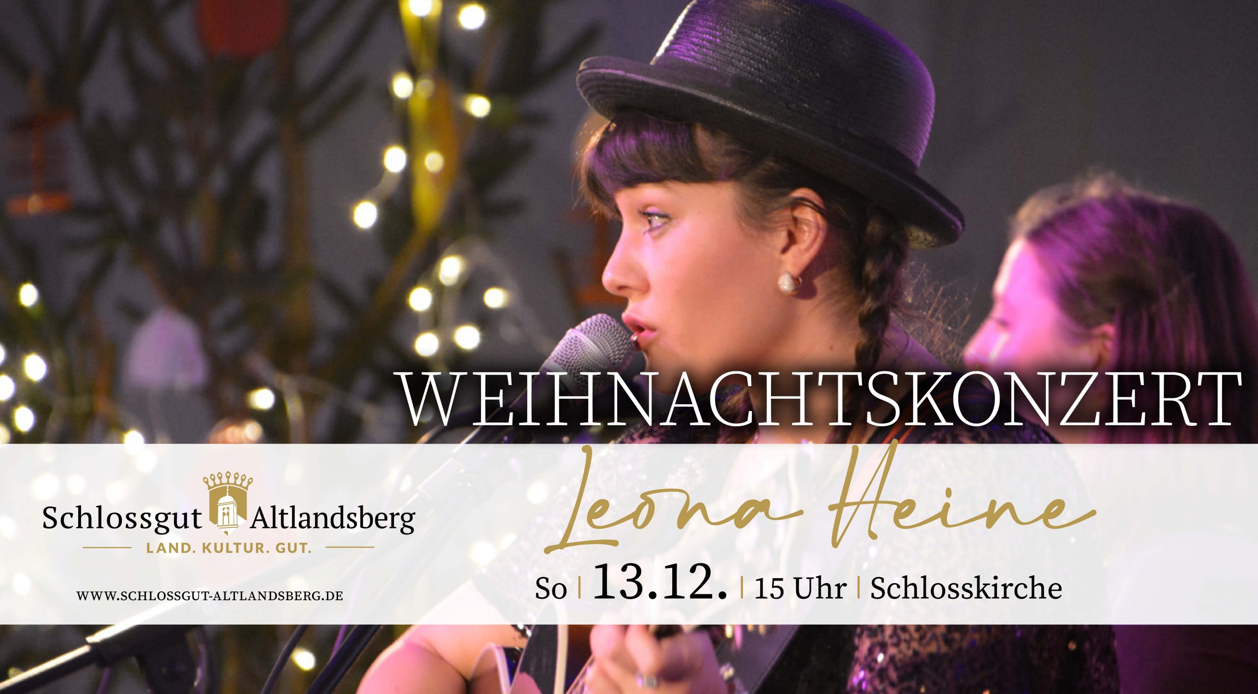 Am 13. Dezember 2026 verzaubert Leona erneut die Altlandsberger Schlosskirche und lädt Familien, Musikliebhaber und Weihnachtsromantiker zu einem stimmungsvollen Adventsnachmittag ein. Leona verbindet gefühlvolle Cover mit ihren eigenen Liedern und schafft damit eine einzigartige Mischung aus Innigkeit, Humor und festlicher Wärme. Bilder, Geschichten und liebevoll ausgewählte Weihnachtssongs bilden den atmosphärischen Rahmen dieses Konzertnachmittags.