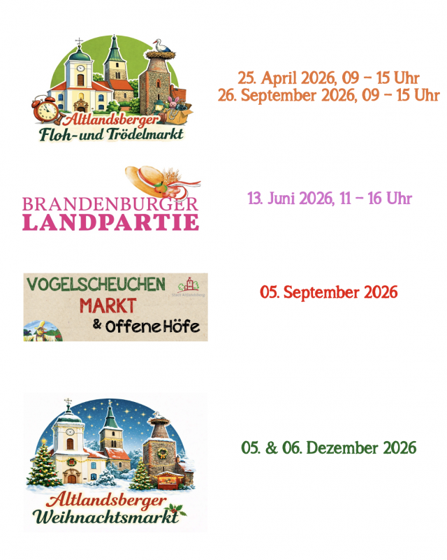 Bei weiteren Fragen zu unseren Märkten kontaktieren Sie uns bitte unter markt@schlossgut-altlandsberg.de oder telefonisch unter der +49 33438 13 47 47.
